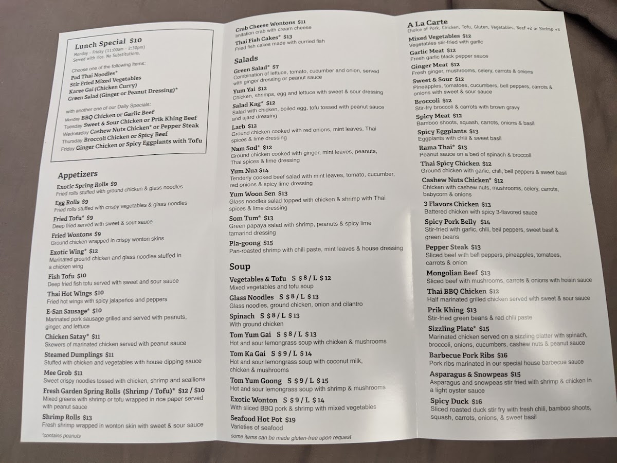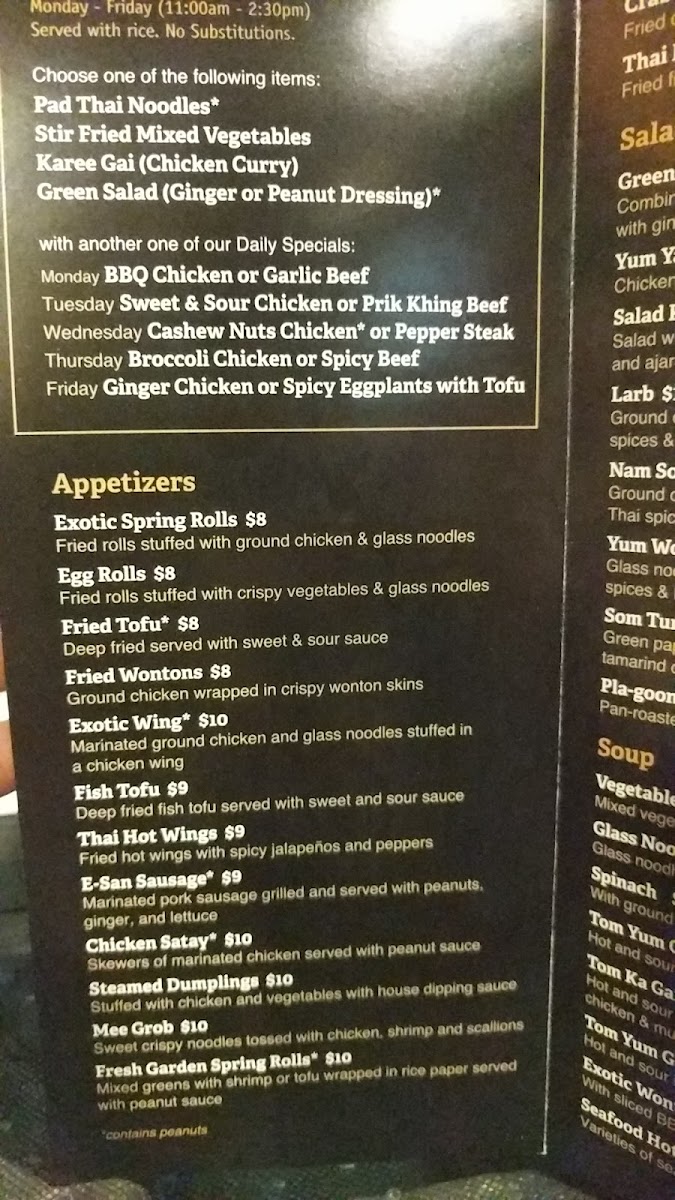 Pan fried wide rice noodles, chicken, bean sprouts, romaine and crushed peanuts. Does not include rice. No added MSG